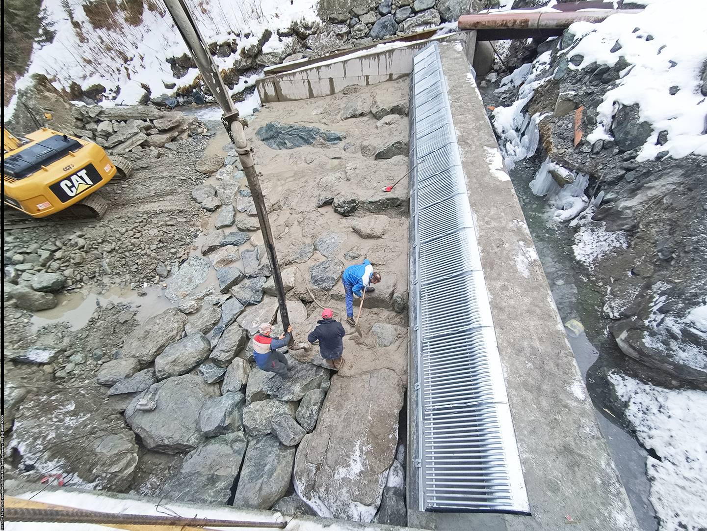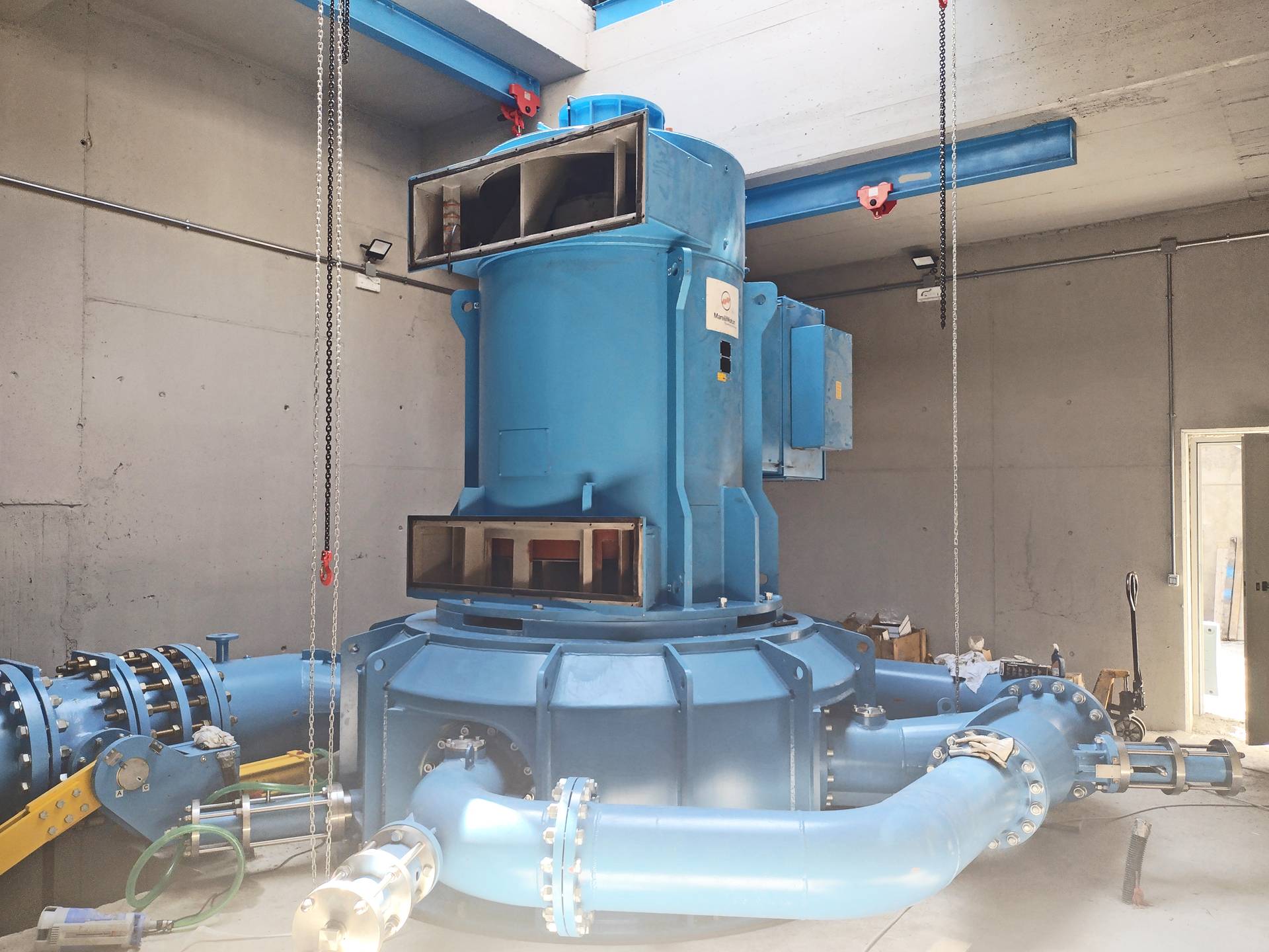 The project implementation phase finally started in July 2022. The altitude of the overall project site was between around 1,480m and 1,650m above sea level, meaning primary work had to be carried out between the spring and autumn months. Due to the risk of avalanches, construction work had to be interrupted during the winter months. According to Alessandro Mosso, the unstable geological conditions posed a major challenge for construction. As a result of the conditions the contractors were required to carry out reinforcement measures on the plant structures and the penstock. The latter is 1,622 metre long and, in sections, navigates very steep terrain, hence needed to be reinforced with concrete anchor points. The power descent is made entirely of robust DN800 steel pipes that guide the water as it drops around 160 metres. Furthermore, a fibre optic cable was installed along with the penstock to facilitate digital communication between the water intake technical systems and the power station control centre. In addition to the penstock for the hydropower plant, a connecting pipe was also laid to feed the agricultural irrigation system. At approximately 950 m long the pipeline also consists of steel pipes, this time DN150-dimensioned conduits.