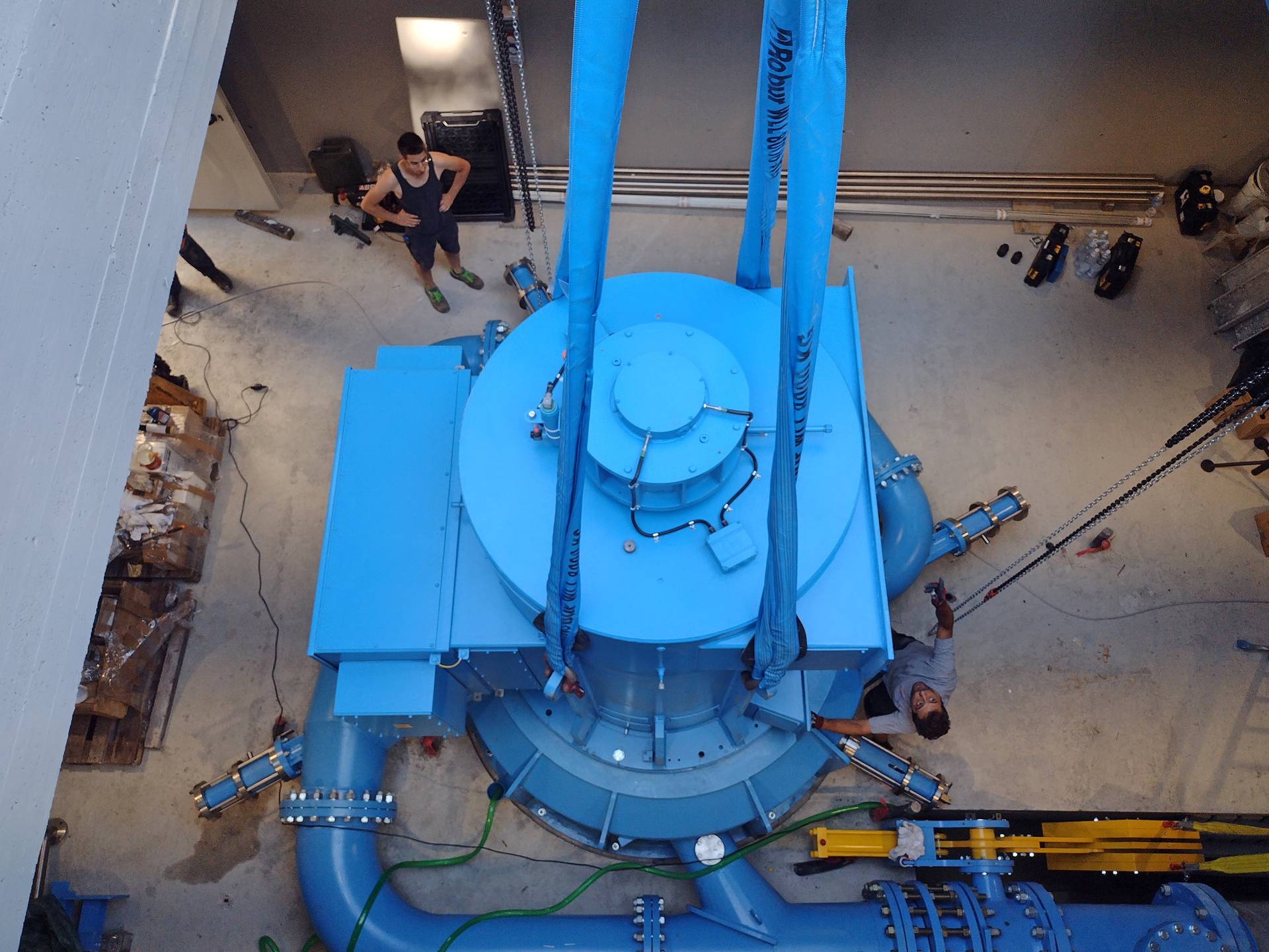 Visual impact on the landscape was minimised by constructing the turbine machine building completely underground. The centrepiece of the well-hidden plant control centre is a 4-nozzle vertical-axis Pelton turbine that drives a generator directly coupled to the runner. The machine set was supplied by Tamanini Hydro The turbine generates 398kW of maximum power at full water supply from an expansion water volume of 1,000 l/s and a net head of 159.11m. The multi-nozzle design enables the machine to operate effectively across a wide range of inflow volumes – and is highly efficient, even when inflow is greatly reduced. The machine set is completed by a 3-phase 1,500 kVA nominal apparent power synchronous generator. The 3-phase air-cooled generator was manufactured by Marelli Motori and was designed for an operating voltage of 3,000 V. The entire electrical and control infrastructure for the powerhouse was also supplied by Tamanini Hydro. Electricity production at the plant is a fully-automated state-of-the-art arrangement, which can be monitored and operated remotely around the clock using a secure online connection. The plant control set-up includes an intuitive visualisation system that provides a clear and simple overview of all the most important information pertaining to the current status of the power plant.